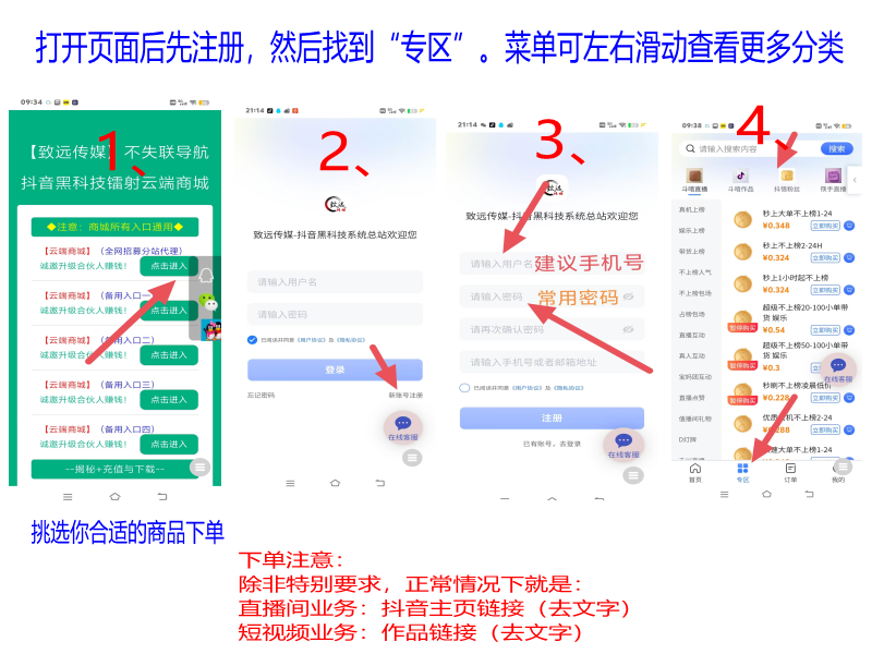 ◐使用流程:注册→登录→充值→下单